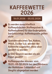 Vom 19.01. bis zum 05.02.2026 sammeln Berliner Bezirke Kaffeepäckchen für die Kältehilfe – denn eine warme Tasse bedeutet mehr als nur ein Getränk: sie schenkt Aufmerksamkeit, Nähe & Menschlichkeit. 💛