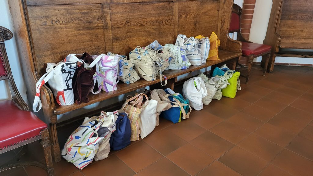 „Der Advent ist die Zeit des Schmückens und des Feierns – überall erblickt man schöne Symbole der Wärme und Geborgenheit.“ Mit diesen Worten begann Pfarrerin Dr. Donata Dörfel am Montag, den 08. Dezember 2025, ihr kurzes Tischgebet zur Weihnachtstütenaktion der „Aktion Warmes Essen“. Tatsächlich beschrieb sie damit auch sehr treffend die Kirche, die mit Kerzen sowie vielerlei Lichtern hell erleuchtet war und mit Tannenzweigen und Weihnachtsschmuck sehr festlich wirkte. „Die Adventszeit gilt zudem als Zeichen der Verbundenheit, Zuwendung, Liebe und Ermutigung,“ fügte sie hinzu und auch dies war am Montag in der Pauluskirche in Zehlendorf unschwer erkennbar. Hinter dem Altar stapelten sich 110 wunderschöne, nachhaltige und voll bepackte Stoffbeutel, die durch unsere Kooperation mit „die Wille“ aus gespendeter Kleidung entstanden sind. Auch in diesem Jahr waren sie wieder mit Kaffee, Tee, Keksen, warmen Socken und anderen kleinen Überraschungen gefüllt, die im Anschluss an das Gebet an unsere Gäste verteilt wurden. Zudem wurde ein wahres Festessen serviert, dass sich jede*r in der Kirche schmecken ließ. Wie immer ging es bei der „Aktion Warmes Essen“ nicht nur ums Essen, sondern auch um Gemeinschaft, Austausch, gegenseitige Unterstützung und Hoffnung.
