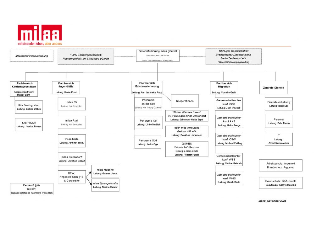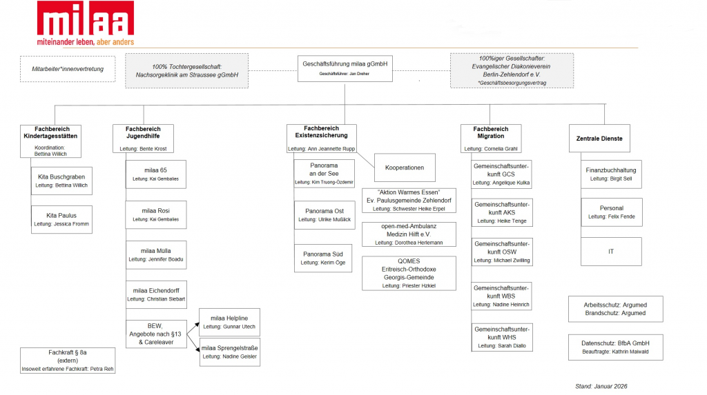milaa steht für miteinander leben, aber anders. Die milaa gGmbH wurde im Juni 2015 durch den Evangelischen Diakonieverein Berlin-Zehlendorf e.V. gegründet und ist Mitglied im Diakonischen Werk Berlin-Brandenburg-schlesische Oberlausitz e.V.. Heute arbeiten circa 190 Mitarbeiter*innen an 18 Standorten und in der Verwaltung für die milaa. Dabei orientieren sie sich am christlichen Menschenbild.