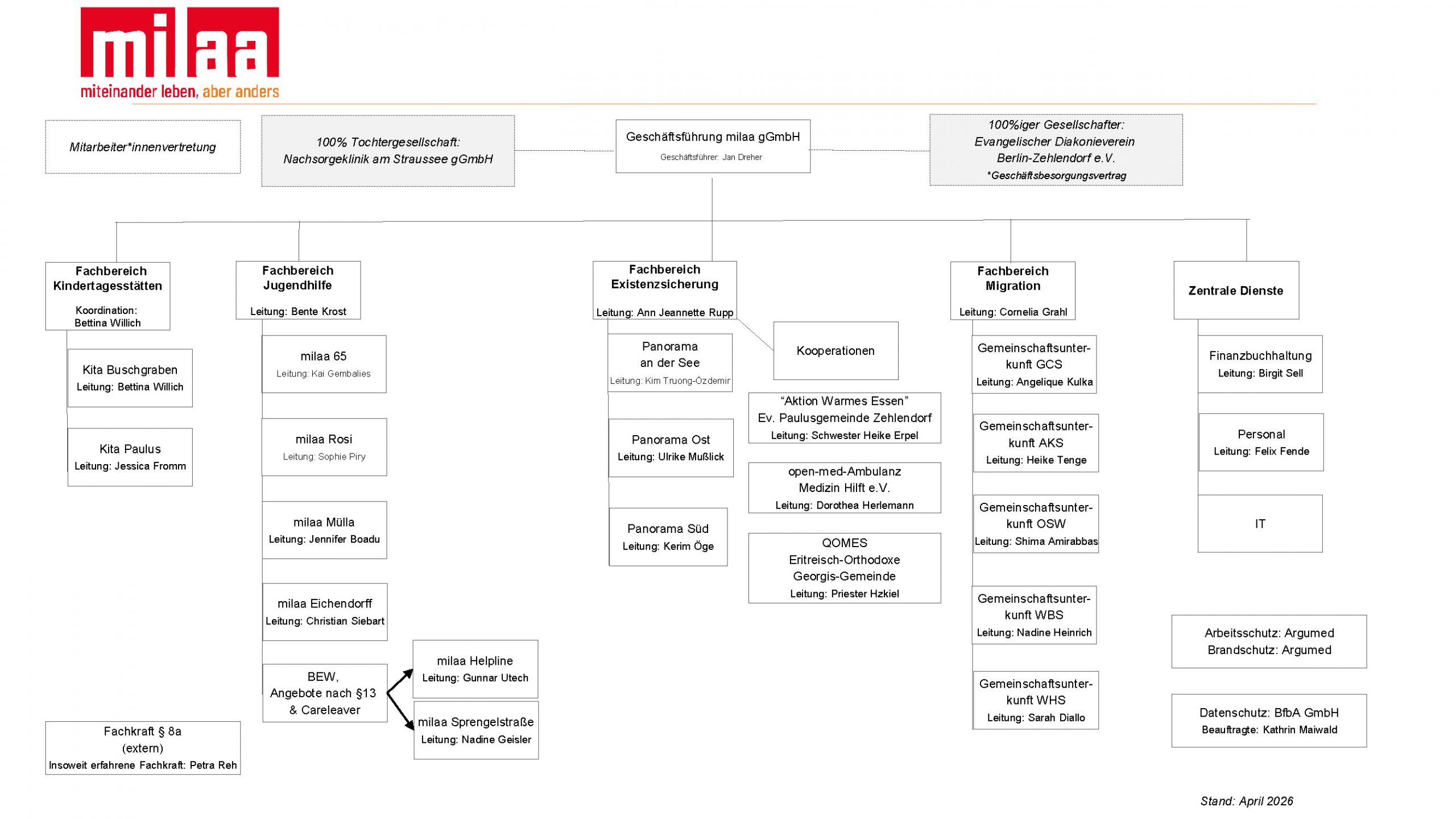 milaa steht für miteinander leben, aber anders. Die milaa gGmbH wurde im Juni 2015 durch den Evangelischen Diakonieverein Berlin-Zehlendorf e.V. gegründet und ist Mitglied im Diakonischen Werk Berlin-Brandenburg-schlesische Oberlausitz e.V.. Heute arbeiten circa 190 Mitarbeiter*innen an 18 Standorten und in der Verwaltung für die milaa. Dabei orientieren sie sich am christlichen Menschenbild.
